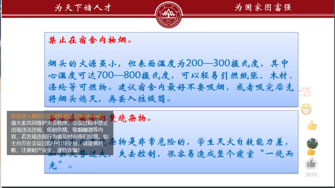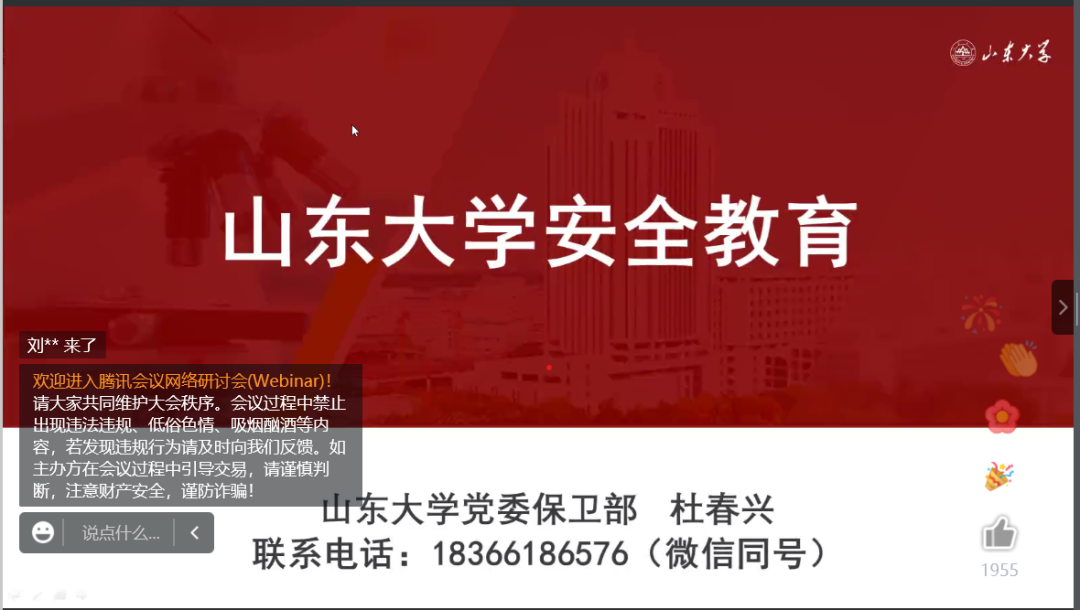 9月9日上午10:00,一场别开生面的安全教育课在腾讯会议线上开展,永利yl23411官方党委保卫部杜春兴老师为新生授课,yl23411永利新生与历史学院、经济学院等学院的新生共同学习了与日常生活息息相关的安全知识。