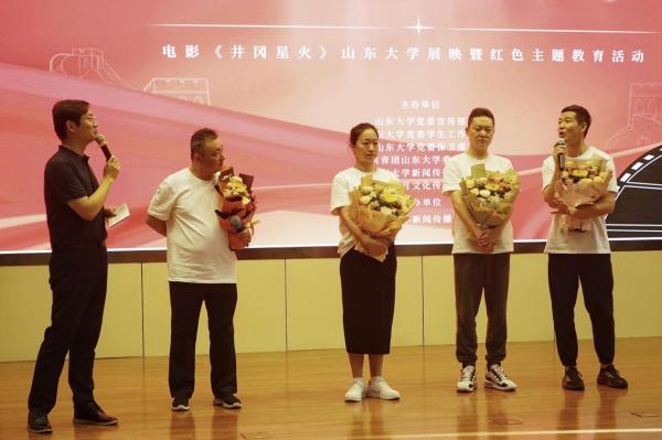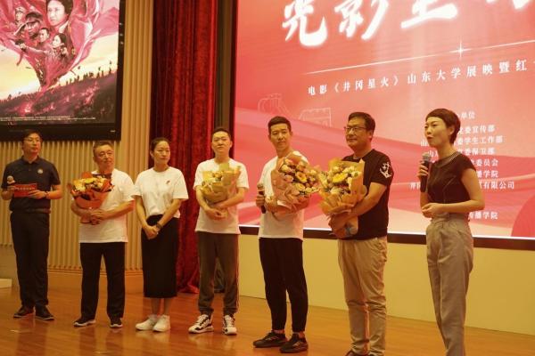 影片放映结束后,主创团队登台与在场师生分享影片的创作心得,介绍电影的创作背景、情节构思、人物角色以及台前幕后的故事。周耀杰在谈及电影思想主旨时表示,自己在影片中非常希望表现出共产党人的坚韧与无私。中国共产党是在任何时刻都全心全意为人民群众谋利益、为民族复兴不懈奋斗的政党,希望当代的青年人能够从影片中得到启发。王玮向大家讲述了构思剧本的心路历程,表示自己尽最大的努力将这段革命历史浓缩在一个半小时的时间里,尽可能让作品的讲述方式被青年受众接受。袁文才饰演者王军结合自己的军旅生活谈到在角色塑造过程中非常重视对人物细节的把握,自己也在揣摩人物的过程中体会到革命先辈的伟大精神。王佐的饰演者杨骏则通过拍戏过程中的故事,告诉同学们伟人是有无穷力量和不朽气场的,要永远怀着敬畏之心回顾这段红色历史。